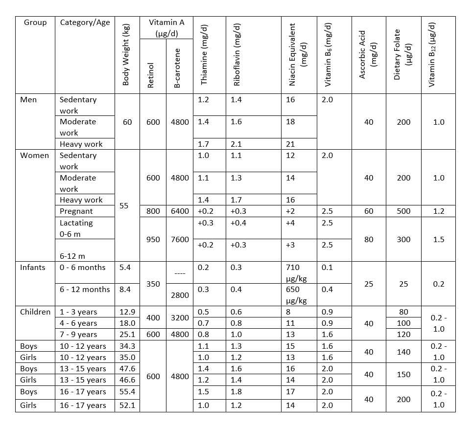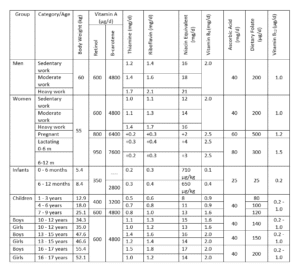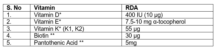 Recommended Dietary Allowance (RDA) for Water Soluble and Fat-soluble Vitamins for Indians – 2010