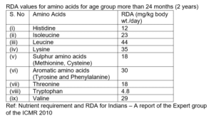 FSSAI has received several representations from stakeholders as well as the regulatory staff seeking clarification on RDA values of different nutrients. In this connection, based on the recommendations made by the Scientific Panel and Scientific Committee, a collated document in respect of the RDA values for vitamins and minerals has been prepared and placed on FSSAI’s website on 27.02.2019. In addition, the Scientific Panel has also recommended RDA values for essential amino acids for the general population using references from ICMR, which was endorsed by the Scientific Committee. The same is enclosed at Annexure II (given below).